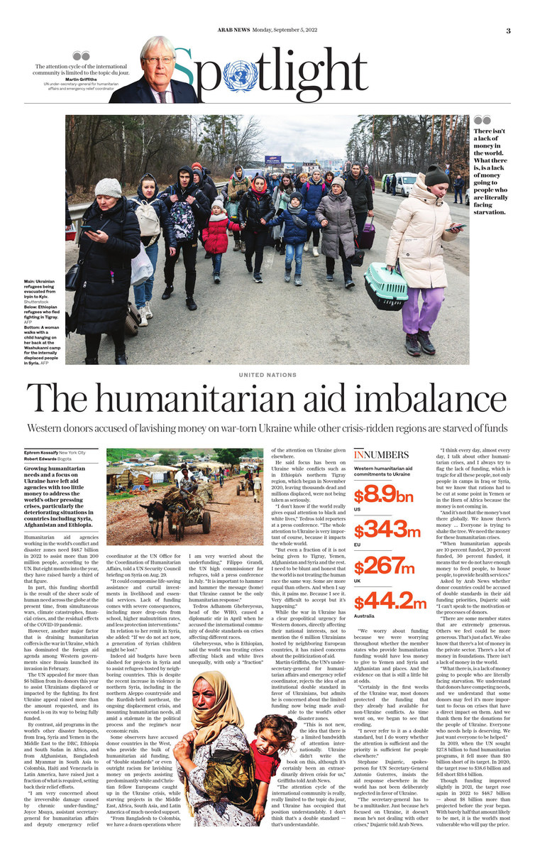 Martin Griffiths, the UN’s under-secretary-general for humanitarian affairs and emergency relief coordinator, rejects the idea of an institutional double standard in favor of Ukrainians over other races or national contexts, but admits he is concerned about the limited funding now being made available to the world’s other disaster zones.