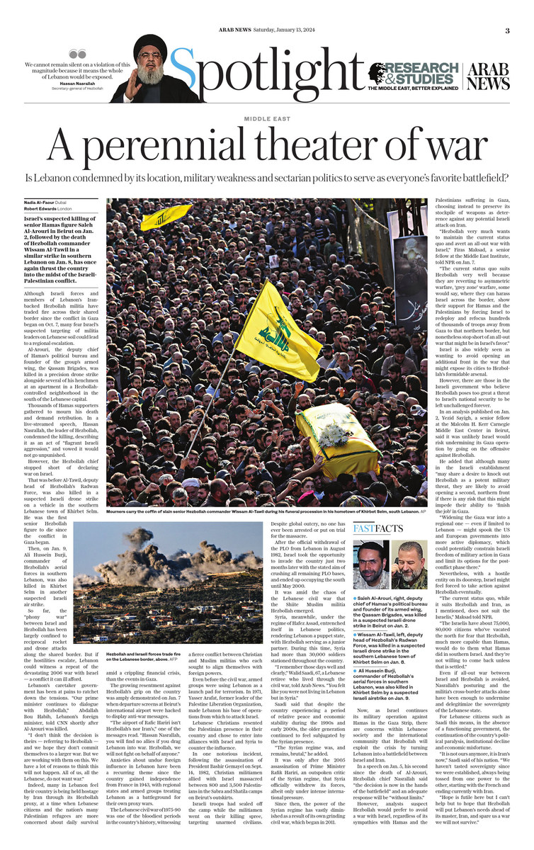 * Saleh Al-Arouri, deputy chief of Hamas’s political bureau and founder of its armed wing, the Qassam Brigades, was killed in a suspected Israeli drone strike in Beirut on Jan. 2.